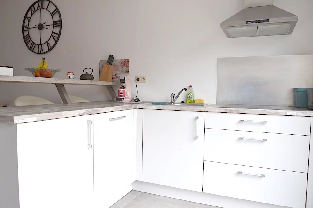 – Cuisine équipée avec four, frigo, plaques vitro, hotte, lave-vaisselle (6,96 m2)